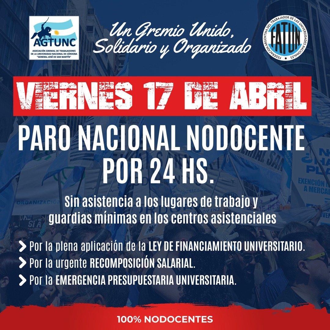 PARO NACIONAL NODOCENTE VIERNES 17/04 POR 24HS - AGTUNC